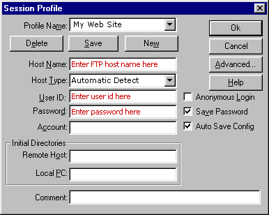 Each time you run WS_FTP the Session Profile window will be displayed. A profile contains the information needed to connect to your web site. Creating a profile now will eliminate the need for you to configure the software each time you wish to connect to the web server via FTP. To create a new profile, click the "New" button and enter a generic profile name at the top of the Session Profile window. Next, enter the userid, password and hostname for your web site as illustrated below.